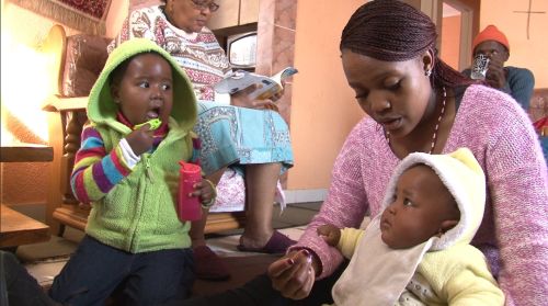 Lee is watching Rantokolo when mom walks down the passage. He starts to cry. Granny comments “When he sees you he starts to cry.” Mom sighs, walks up to him and puts out her hands to pick him up. Leago reaches for mom, who then sits down with him on the floor. Leago stares at the TV while mom claps her hands and “high-five’s” him. Each time she stops clapping he looks at the hands and starts to cry so mom continues.