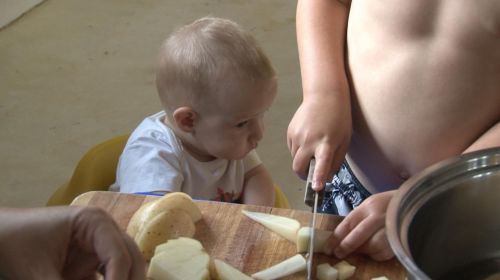 Sofia, having just been fed, is nestled on mom’s hip in the kitchen where mom is starting to prepare supper. Luca has joined them and mom puts Sofia in her plastic seat so that she can sit upright, next to the children’s table in the kitchen where mom is letting Luca help to cut potatoes for french-fries. Although mom is trying to make long French-fries she allows Luca to cut the potatoes into small blocks, encouraging him as he goes.