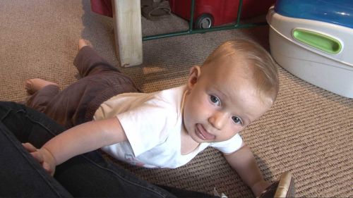 Sofia is on the carpet in the Luca’s room. She is playing with a toy. Raphael is getting undressed to bath. When Sofia notices the filmmaker she drags herself towards her before getting distracted by her toys. She continues to play, rolling herself over and moving incrementally forward towards the filmmaker. When she reaches the filmmaker she explores her shoes and laces, looking up occasionally and then back at the shoes and jeans. Nomsa enters the room and lifts a smiling Sofia up and takes her to the corner chair to feed. Sofia drinks noisily through a blocked nose. Luca cries from the bathroom and Nomsa responds, returning briefly to feed Sofia before putting her in the large crib with a toy and then leaving to fetch Luca. Sofia picks up the toy and starts to examine it.