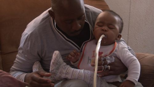 Banele is sitting upright on the couch, balancing himself. Dad is with him and has two rattle toys in his hands that he is shaking to attract Banele’s attention. Banele is bobbing back and forth, raising his eyebrows and vocalising towards the filmmaker, smiling every now and then. When he becomes unsettled dad calls for a bottle and feeds him. He drinks from the bottle and soon after finishing most of the content Banele vomits a fountain of milk onto dad and the floor. Dad says to the filmmaker “He drinks more milk. That’s why he vomits.” “Auntie” get up to fetch a cloth to start cleaning up. Dad sits calmly waiting and wiping Banele’s face. Zanele comments on how much vomit there was and then says to Banele “Hey Banele, don’t ever vomit like that again or I’ll hit you on the head”.