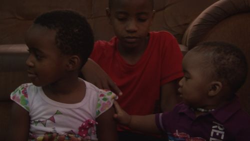 Banele is holding his throat and making a strange sound, as if holding his breath. Dad notices this and moves the beads around his neck. Dad then goes to get a bottle for Banele. Banele continues to scratch at his throat, then coughs. The other children notice this and fiddle around his throat to assist him. Dad returns and picks Banele up to feed him. He falls asleep soon after drinking his bottle.