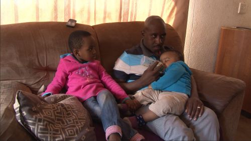 Banele is still being fed from the bottle, lying back on dad’s lap. Zanele is perched on the arm of the couch, just behind Banele and dad. She is leaning onto dad who, after a while, instructs her to move round onto the couch. Banele is sucking from the bottle but is almost asleep. Zanele is trying to find a place on the couch next to dad and Banele. Dad looks at her, using his eyes to tell her to make more space between them. Zanele touches Banele’s feet momentarily before moving further away. The TV is on and dad is watching. Everyone is sleepy. Banele wakes crying and is quickly given a different bottle, now with tea not water, to get him back to sleep. He settles quickly and falls asleep sucking. Dad glances at the filmmaker a few times in silence. Dad too falls asleep and Zanele lies on her edge of the couch, eyes shut, coughing occasionally.