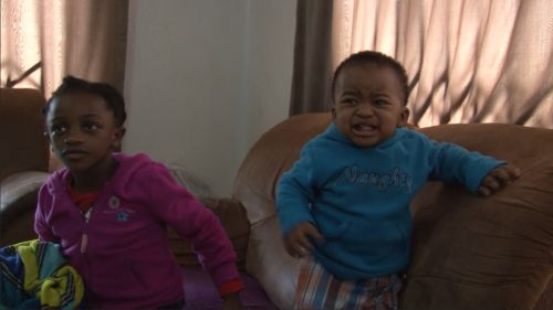 Banele is at home with his sisters. He is sitting on Sihle’s lap and she is encouraging him to reach for a toy that the is holding just out of reach. Banele stretches for it and stands up on the couch, supported by both the couch and Sihle, to increase his reach. At one point he becomes aware of the filmmaker and Sihle jokingly tells him to look at the camera. Banele smiles a bit shyly and burries himself in Sihle’s neck.