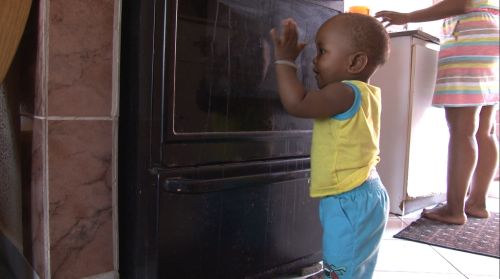 Leago is playing with a mobile phone – turning it over and inspecting it from all sides. Mom and a visiting relative chat about various matters, including mom traveling to Pretoria to try to see the body of Nelson Mandela, lying in state. Leago entertains himself, following mom towards the kitchen and then sitting alone playing with a toy. After a while he crawls to the kitchen and notices his reflection in the oven door. He pulls himself into a standing position, facing closely the reflection, and interacts with it for a while. The adults notice and comment on this. Leago then moves to stand holding mom’s leg while she cooks. He squeals a bit when mom does not pick him up. Finally she does and throws him into the air. He smiles and laughs in response.