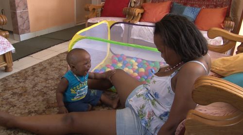 Leago is about to turn one year old. He is playing with his gift – a plastic ball-pen. He is inside and mom outside the pen. Mom sits on the couch and sings happy birthday to him. Leago raises his hands and waves at the “hooray” part of the song. Mom gets onto the floor to play. They are laughing as mom lifts and lowers the mesh netting between them – a type of hide and seek. Leago laughs with his whole body. This is repeated a few times before mom takes Leago out of the ball-pen and tells him to stand up. He is steady on his feet and moves towards her. He is in search of her breasts. He stand between mom’s legs and feeds on her right breast. He looks around while feeding and smiles at the camera, still holding mom’s breast in his hands. Mom comments “You are playing with my breast”. Leago shows some frustration and arches his back, mom quickly replies “Ok, take, take” and he returns to sucking. In response to mom’s complaint “You are pinching me” Leago appears to bite and pull away from the breast. Mom shrieks from pain and Leago starts to shake his head and body, a high pitched sound coming from him. Mom, after a scowl-faced stare, invites him to return to sucking and offers the other breast. At first he seems to want the right breast but then settles into feeding on the other. His one hand playing with and squeezing the right breast.