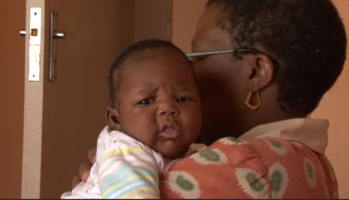 Leago is asleep but restless, face down. Granny turns him. He is waking, groaning. She watches, amused for a while before picking him up. Leago’s eye seem locked on the camera (the unusual presence in his space). Mom enters, having just finished bathing and dressing herself and granny hands Leago to her. They are both wondering what is wrong. Mom comments that “we have really disturbed him” as Leago cries loudly.