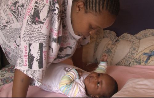 Continued from 01 - Leago is feeding, eyes fixed on the camera. He feeds hungrily. Mom changes Leago and plays with him on the bed – he on his back and she bending over him. Leago is unsettled again and mom and granny try out different responses wondering what the problem is.