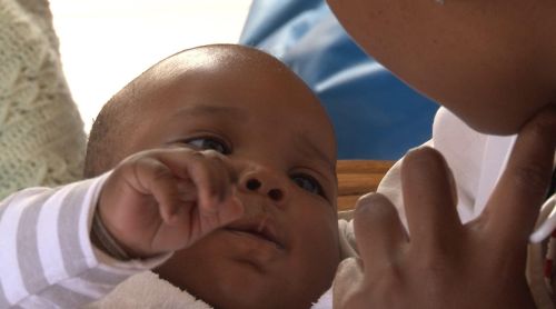 Leago is lying on mom’s lap looking into her face. Mom is telling a story about a boy who lives with his granny and mother; who goes to crèche and then to school and then to work. At times they both laugh and at times Leago’s expression is uncertain.