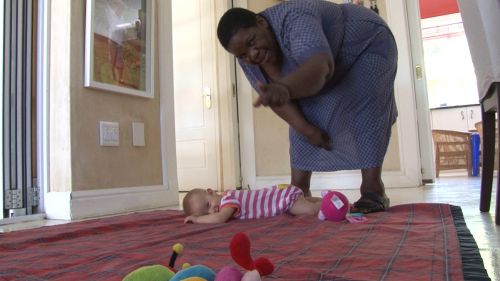 Sofia does not settle to go to sleep. She has been placed on a play mat on the floor inside. Nomsa leaves her with a few colourful toys. Sofia plays with the different toys by rolling herself around the mat and accidentally arriving at a toy to explore. She looks at the toys closely. Nomsa arrives and stands over her – both with their hands outstretched – but Sofia withdraws her hands and Nomsa quickly leaves her to play, watching her from close by. When Sofia becomes distressed Nomsa places a small plastic chair in front of the filmmaker and puts Sofia in it, with a worm-like toy. Sofia continues to play with the toy – handling it easily and picking it up once she has dropped it. She looks at the worm's “face” closely and focuses on its eyes.