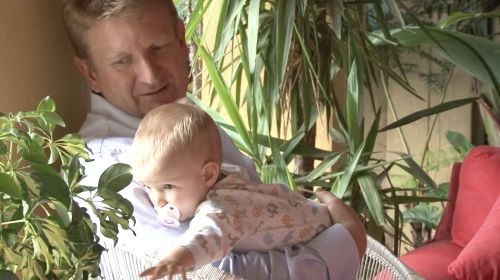Sofia is sitting on Shirley’s lap on the veranda outside. Luca is playing with some toys and Raphael is learning to write numbers, under Shirley’s guidance. Shirley is also talking to Sofia who does not respond. Dad arrives home with a loud entrance “Hello, my big boy” and he proceeds to give Luca a kiss. Raphael continues with his writing and Sofia watches the activities with little expression. “This is a very quiet reception” comments dad. Dad moves to Sofia who gives a small smile. She makes no eye contact. Dad repeats his comment about the subdued reception asking if the boys slept today. Raphael shows dad his number writing and dad responds enthusiastically.
