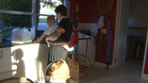 Continuing from Clip 02: Sofia is on the carpet with a toy. She is rubbing her eyes and looking closely at the toy. Mom’s voice enters the room, greeting Nomsa and the filmmaker and then calling to Sofia, who has not yet responded to her voice. As Sofia hears mom calling her she drops the toy, rolls towards mom and drags herself a few arm-reaches closer, smiling broadly. Sofia’s hands are stretched up towards mom who picks her up and kisses her several times. Mom comments on how nice Sofia smells, tells her she has brought her lots of food and then tells Nomsa she is going downstairs to prepare supper. She leaves with Sofia in her arms. Sofia is touching mom’s necklace. Mom goes into the kitchen and chats with the boys about pizza for supper, while carrying Sofia on her hip. Mom gives Sofia a carrot and places her, sitting firmly herself, on the carpet. The boys play around Sofia who explores both ends of the carrot in her mouth. The boys chat to the filmmaker who responds, particularly to Luca’s direct engagement with her. Sofia watches the boys passing back and forth in front of her.