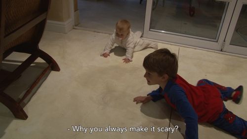 Sofia is on the floor in the kitchen with her brothers. Raphael is pulling Luca around and telling him “I’m taking you to jail”. Shirley is sitting on a stool in the background. Sofia is watching the activity and crawling (this is the first time the filmmaker has seen her crawling fully) to see what the boys are doing. She is also exploring the room around her.