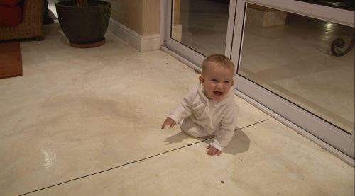 Cont. from clip 01: Sofia is brought downstairs to the living-room. She is crawling around when dad arrives home and greets the filmmaker. Sofia does not respond to his voice. Soon after, dad greets Sofia who responds with a large smile and moves towards him. Dad picks Sofia up. Smiling, he asks the filmmaker is she has seen Sofia standing. The filmmaker replies that she has and that Sofia is "a bit fearless". Dad comments on the scratch on Sofia’s cheek. He is in a rush as the house is for sale and potential buyers are arriving soon. Dad is checking lights and hands Sofia over to Shirley so that he can change and prepare for the house viewing. Sofia goes to Shirley, looking back towards where dad is moving off to. She does not respond to him leaving.