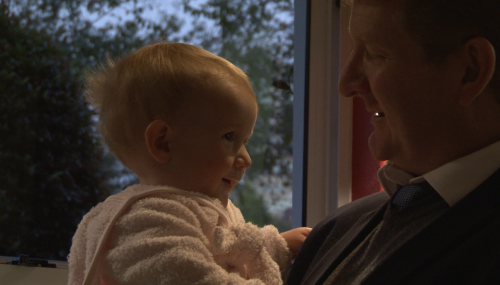 It is evening in the nursery. Sofia watching Pia and Raphael getting dressed after their bath. Nomsa is helping them. Dad enters and greets Pia and Raphael with hugs, and says hello to Nomsa. Sofia’s expression lights up when dad enters. She waits for him to greet the others for a moment and as his attention turns to her, she crawls to him and bobs up and down as he crouches to pick her up. Dad and Sofia have a chat and dad puts Sofia down to go and change. As she reaches the floor she begins to cry, and dad responds by picking her up again. Dad kisses her as she rubs her eyes and Pia says from below “she wants daddy, she wants daddy”. Fia moves towards and away from dad so that he can give her some repeated kisses on her forehead. They have a to-and-fro interaction. Dad puts Sofia down while he helps Raphael with his dressing gown. Sofia, holding onto dad’s legs, stands up against him and looks around at the activities in the room.