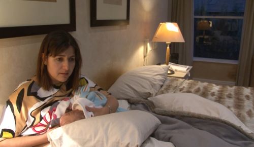 Sofia is niggling and then screaming in the pram. Finally Nomsa collects her and talks to her about her being hungry and that mom has just arrived home to feed her. Mom and the brothers arrive back and enter. Nomsa tells mom she is just in time to feed a hungry baby. Mom takes Sofia upstairs and after some time of crying and calling for her feed, mom is ready to feed Sofia, although much other activity from siblings is going on simultaneously.