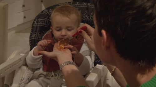 Nomsa has changed and is ready to leave for the day. Sofia and her siblings are downstairs with mom who is choosing some music to listen to. With Sofia on mom’s hip, mom fetches her food from the kitchen and settles down to feed, placing Sofia in the highchair and strapping her in. Mom swops the knife that Sophia is mouthing for a spoon. As the first spoon of food is presented to Sofia she puts her hands up and pushes it away. “Yum”, says mom but Sofia covers her mouth. Mom puts the spoon back in the bowl and transfers the food from the spoon onto mom's hand and offers it to Sofia. She tastes the food, scrunching up her face as she tastes it, but then continues to take from mom and to feed herself. Mom intersperses Sofia taking and feeding herself with the occasional spoon full of food. After a while Sofia starts to shake her head in time with the music. Mom moves the spoon away for a moment before offering more food, which Sofia takes. A few more mouthfuls follow by some resistance. Raphael, in the background, comments that this is the last food for Fia and that mom must come to him and Luca. Mom tries to slip another mouthful of food in but Sofia covers her mouth and shakes her head. Mom puts the food down, takes of the bib and tries one last spoon of food. Sofia shakes her head, waves and claps her hands saying “uh uh”. Mom copies her “Uh uh”, both shaking their heads. One last attempt is pushed away, “Okay, you’re done” says mom. “Thank you mommy, that was yummy” mom says on Sofia’s behalf.