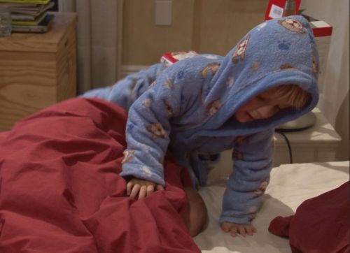 Sophia is still asleep, covered up in mom’s bed. When the boys return from bathing they jump around wildly on the bed – Luca trying to see what will happen if he stands on Sofia’s head. She does not respond. There is a lot of activity on the bed as the boys explore and test boundaries with the new sibling – Luca wanting to cover Sofia’s head while mom tries to explain why she needs to breath. Mom looks tired. Mom and the boys sing the nursery rhyme “Ring a ring a rosy” – about death during the black plague.